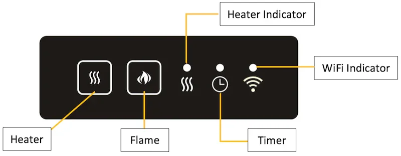 1. The onboard control buttons are located on the top left of the unit. Press and hold the Heater button for 5 seconds and release, the WiFi Indicator will begin to flash, indicating the fireplace is ready to connect to WiFi.