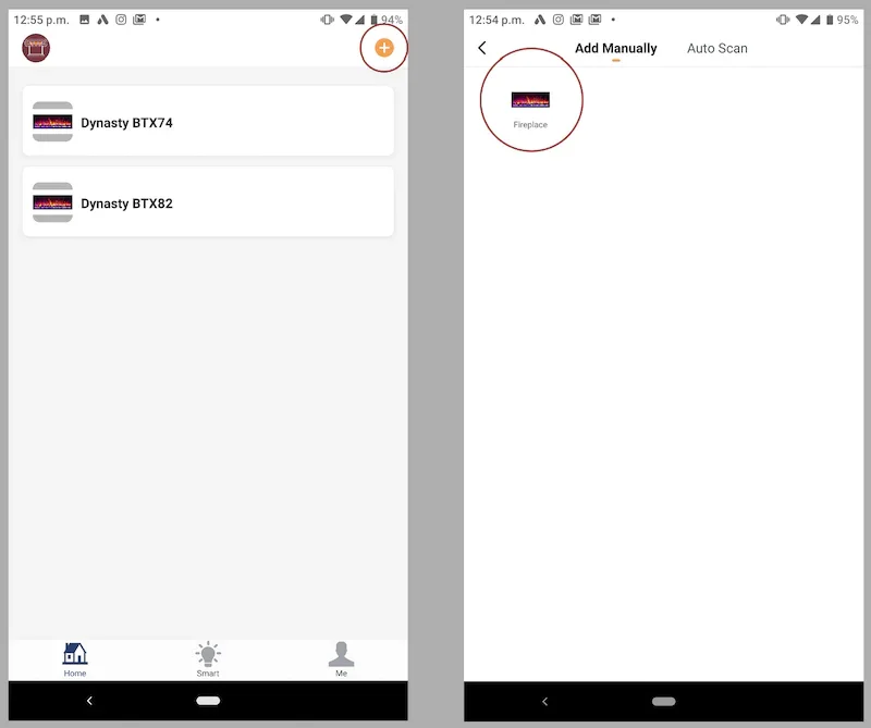 2. In the app homepage, select the add device button on the top right, then select Fireplace under the tab "Add Manually."